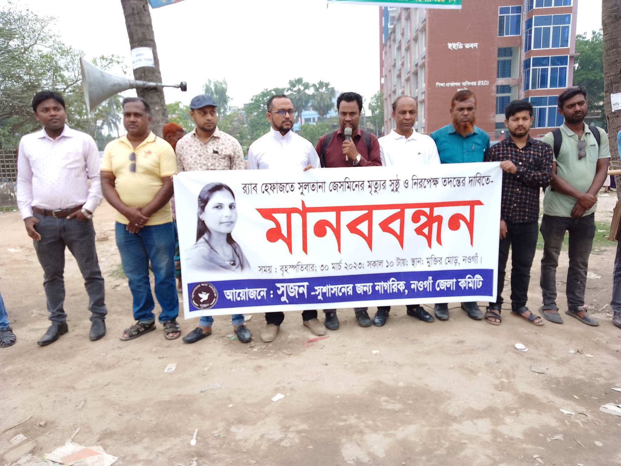 র্যাব হেফাজতে নওগাঁয় ইউনিয়ন ভূমি অফিসের অফিস সহায়ক সুলতানা জেসমিন এর অস্বাভাবিক মৃত্যুর সুষ্ঠু ও নিরপেক্ষ তদন্তের দাবীতে মানববন্ধন অনুষ্ঠিত হয়েছে।