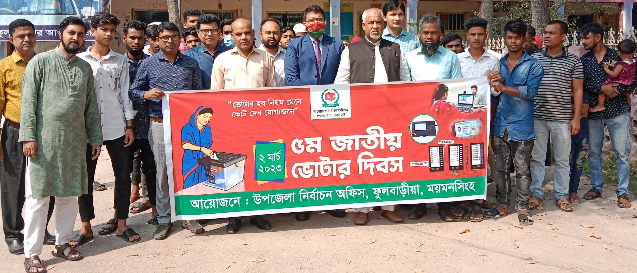 সারা দেশের ন্যায় ময়মনসিংহের ফুলবাড়িয়া উপজেলায় ৫ম জাতীয় ভোটার দিবস পালিত হয়েছে। ২ রা মার্চ ২০২৩ইং বৃহস্পতিবার সকাল ১১ টায় জাতীয় ভোটার দিবস উপলক্ষে র্যালি ও ভোটার নিবন্ধন সেবাসহ অন্যান্য সেবা দেওয়া হয়। এখন নতুন ভোটার নিবন্ধন ও সংশোধনের আবেদন আগের তুলনায় দ্রুত দেওয়া হচ্ছে। নির্বাচন অফিসার মোঃ তাজুল রায়হান বলেন, আমরা মানুষকে আগের চেয়ে দ্রুত সেবা দিয়ে থাকি, কেউ আমার কাছে আসলে আমি তাকে তাড়াতাড়ি সেবা দেওয়ার চেষ্টা করি যাতে তাকে আর ঘুরতে না হয়। ভোটার দিবসে উপজেলা নির্বাহী অফিসার জনাব মোঃ নাহিদুল করিম বলেন নতুন ভোটার নিবন্ধন ও সংশোধন আবেদন গুলো একটু তাড়াতাড়ি করে দিতে। তিনি আরও বলেন অনেকে চেয়ারম্যানদের স্বাক্ষর ও প্যাড নকল করে ভোটার নিবন্ধন করার তথ্য পাওয়া যায় তাদেরকে চিহ্নিত করে আইনের আওতায় এনে শাস্তি দিতে হবে। উপজেলা চেয়ারম্যান আলহাজ্ব আব্দুল মালেক সরকার বলেন আগে আমার কাছে নির্বাচন অফিসের সেবার ব্যাপারে প্রতিদিনই অনেক অভিযোগ আসতো কিন্তু আপনি আসার পর এখন আর সেই অভিযোগ আসে না। তিনি জাতীয় ভোটার দিবস এর সফলতা কামনা করেন। এসময় আরও উপস্থিত ছিলেন উপজেলা ভাইস চেয়ারম্যান আলহাজ্ব শরাফ উদ্দিন শর, উপজেলা সিনিয়র মৎস্য কর্মকর্তা মোঃ হাবিবুর রহমান, উপজেলা প্রকল্প বাস্তবায়ন কর্মকর্তা মোঃ শাখাওয়াত হোসেন, উপজেলা প্রকৌশলী মোঃ মাহবুব মোর্শেদ, উপজেলা সমবায় কর্মকর্তা মোঃ জাহাঙ্গীর আলম, হিসাব রক্ষণ কর্মকর্তা মোঃ রফিকুল ইসলাম, ৬নং ফুলবাড়িয়া ইউনিয়নের চেয়ারম্যান মোঃ জয়নাল আবেদীন বাদল প্রমুখ।