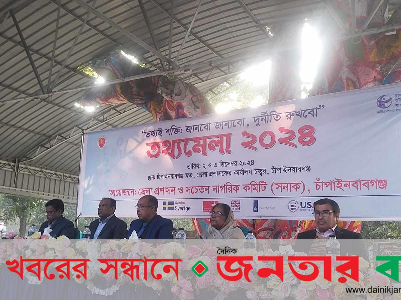 চাঁপাইনবাবগঞ্জে জেলা প্রশাসন ও সচেতন নাগরিক কমিটি (সনাক)-এর যৌথ উদ্যোগে দুই দিনের তথ্যমেলা শুরু হয়েছে। সোমবার বিকেলে জেলা প্রশাসকের কার্যালয় চত্বরে বেলুন উড়িয়ে মেলার উদ্বোধন করা হয়। পরে জেলা প্রশাসকের কার্যালয় চত্বরে বটতলা মঞ্চে আলোচনা সভা ও গণশুনানি অনুষ্ঠিত হয়।