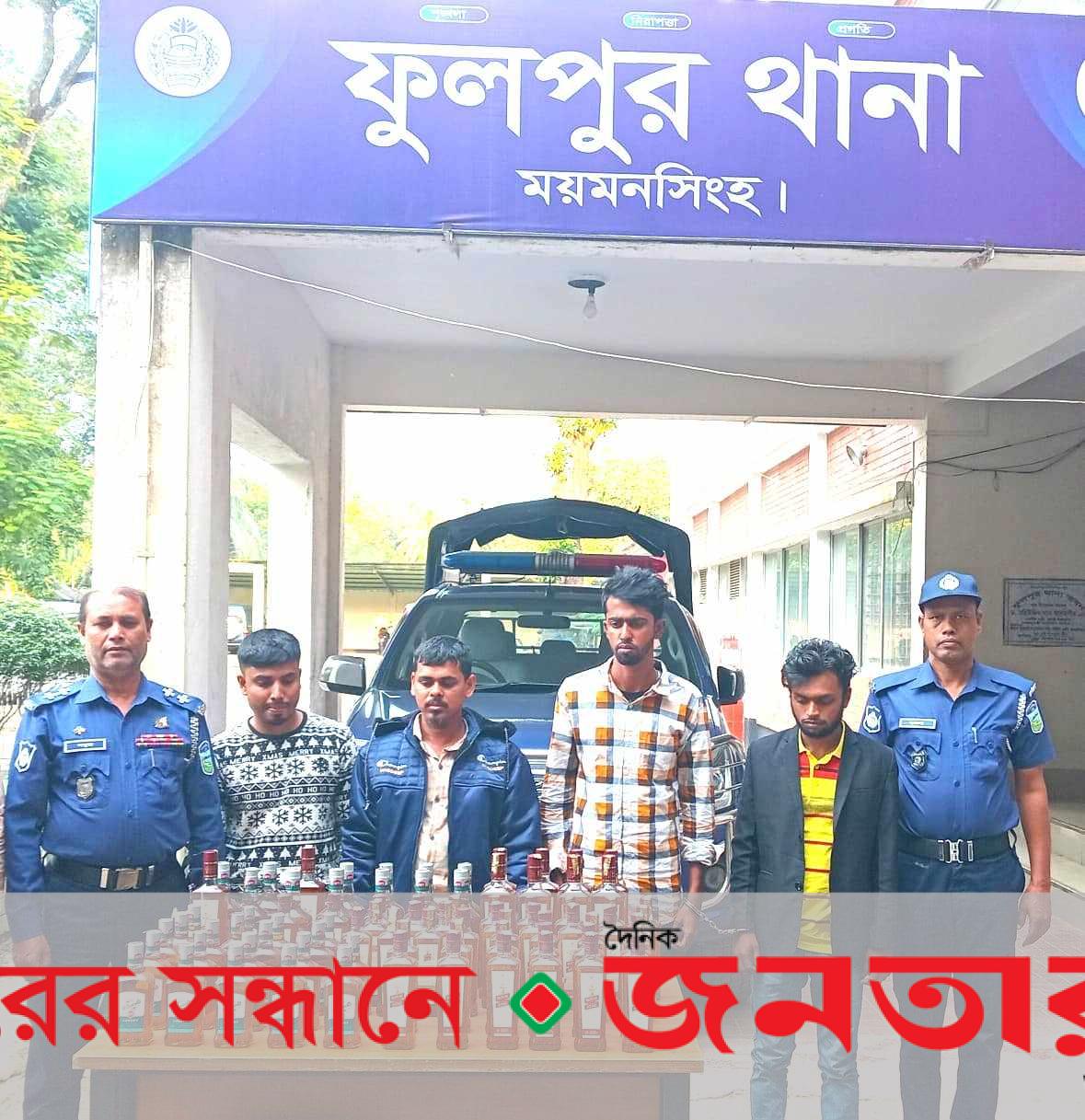 ময়মনসিংহের ফুলপুর থানা পুলিশের অভিযানে অদ্য ইং ২২/১১/২০২৪ তারিখ সকাল প্রায় ০৬:৪৫ ঘটিকার সময় ফুলপুর থানাধীন কুরিয়ার ব্রিজ উপর গোপন সংবাদের ভিত্তিতে ফুলপুর থানা অফিসার ইনচার্জ মোঃ আব্দুল হাদির দিকনির্দেশনায় ফুলপুর থানার একটি চৌকস টিম এস আই সবুজ মিয়ার নেতৃত্বে এএস আই মোজারুল ইসলাম, এএসআই সামিউল হক, ও পুরো সদস্য সহ চেকপোস্ট পরিচালনাকালে ০৪ জন মাদককারবারীসহ একটি প্রাইভেটকারে ভারতীয় নিষিদ্ধ আমদানিকৃত ৮০ (আশি) বোতল মদ আটক করা হয়েছে। উক্ত আসামীদের বিরুদ্ধে ফুলপুর থানার মামলা নং-১৬, তারিখ-২২/১১/২০২৪; ধারা- ৩৬(১) সারণির ২৪(খ)/৪১ মাদকদ্রব্য নিয়ন্ত্রণ আইন, ২০১৮ রুজু করা হয়েছে। উক্ত মামলায় এজাহারনামীয় গ্রেফতারকৃত আসামী হলো ১. মোঃ শাকিল মিয়া(২০), পিতা-আনোয়ার হোসেন , সাং-ঢনঢনিয়া, উপজেলা/থানা- শ্রীবর্দী, জেলা-শেরপুর, ২. মোঃ মুছা মিয়া(২৫), পিতা-নুরু হোসেন ৩. বায়োজিদ @ দয়াল(২২), পিতা-আব্দুল হাই মন্ডল , উভয় গ্রাম- বরাক, থানা-হালুয়াঘাট, জেলা -ময়মনসিংহ, ৪. মোঃ সুজন মিয়া(২৫), পিতা-মোঃ সুরুজ আলী , সাং-মেকিয়ারকান্দা, থানা-ধোবাউড়া,
