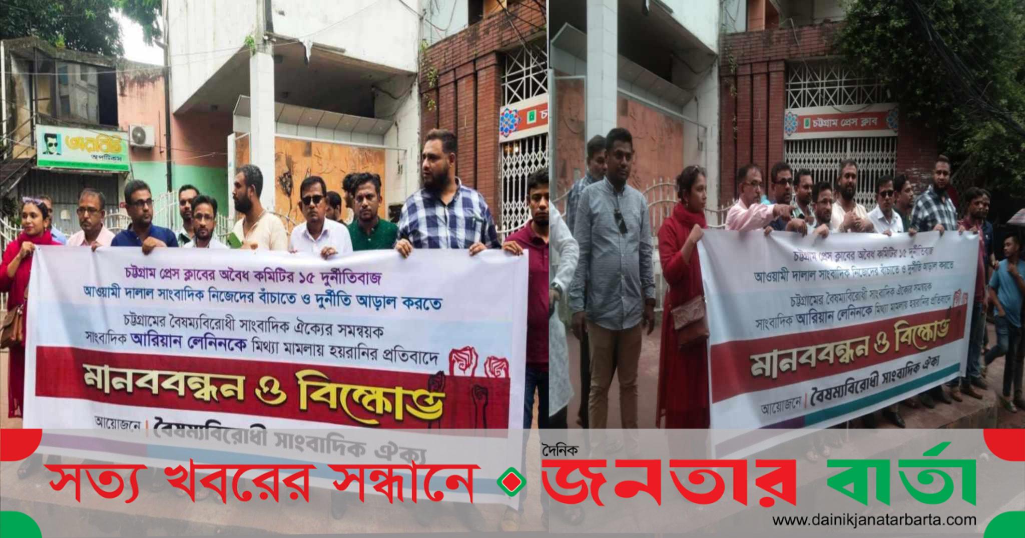 সাংবাদিককে মিথ্যা মামলায় ফাঁসানো ও হয়রানির প্রতিবাদে চট্টগ্রাম প্রেসক্লাবের সামনে মানববন্ধন